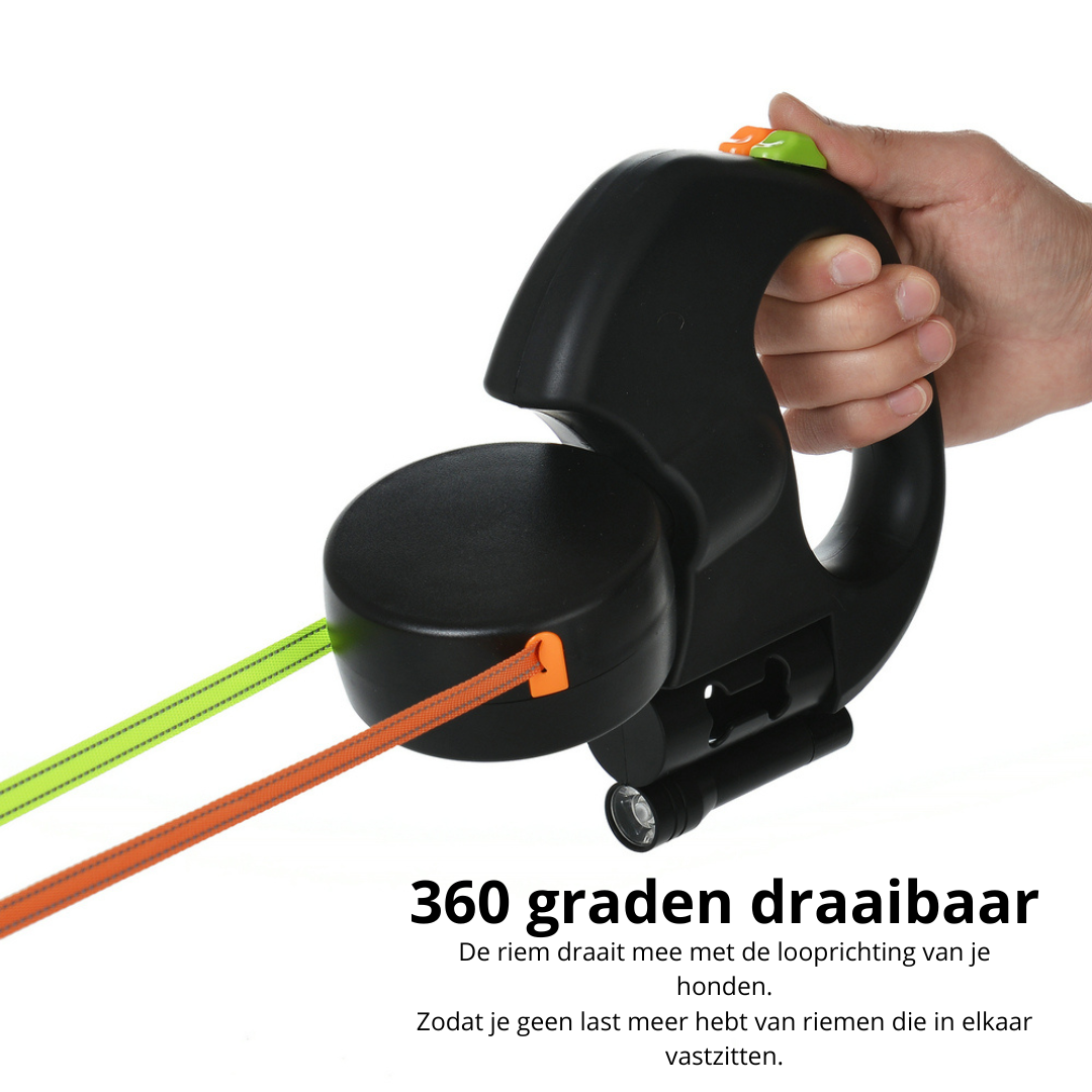 Volledige Controle: De intrekbare riemen zijn afzonderlijk te bedienen met kleurgecodeerde remknoppen. Hierdoor kun je elke hond apart sturen en stoppen.